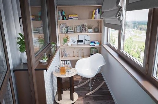 Третий важный элемент интерьера – стол. Поставить чашку с ароматным напитком, положить книгу, телефон или рабочий ноутбук – он точно пригодится. В квадратной лоджии можно сделать широкий подоконник, который одновременно заменит стол и полку для чего-то необходимого (например, комнатных цветов).